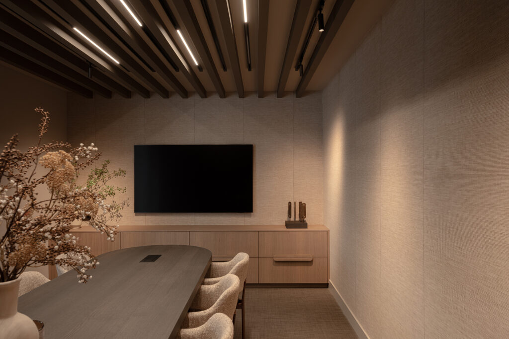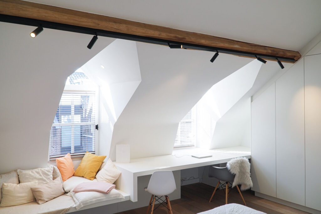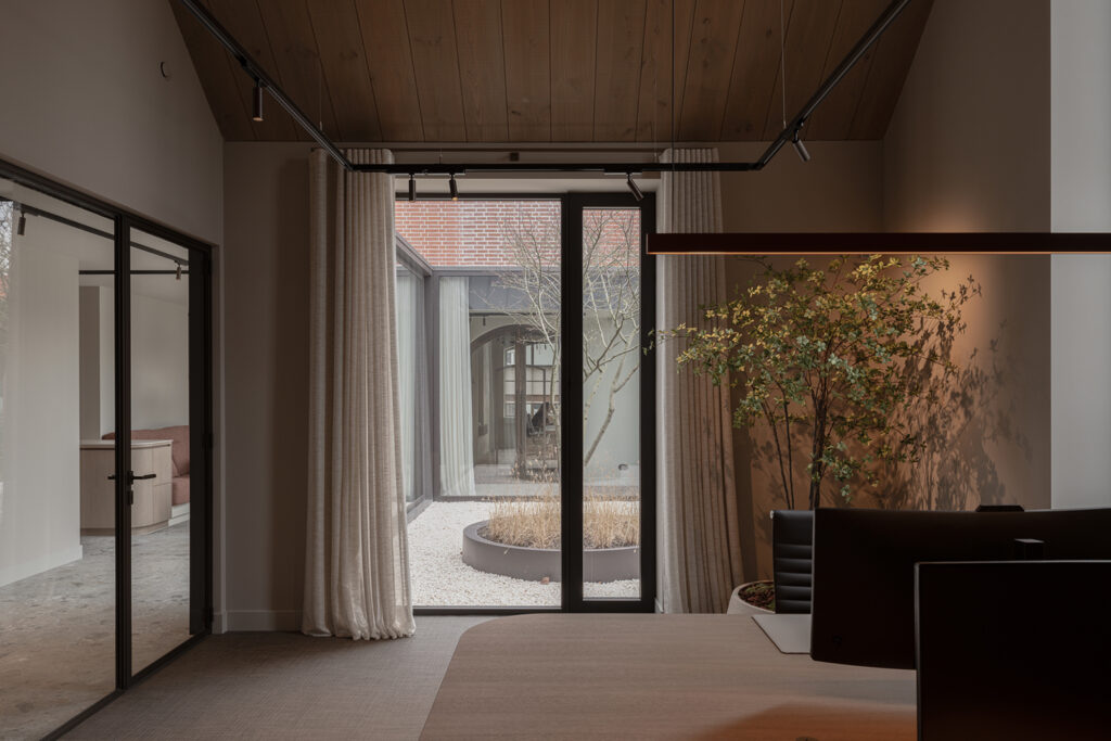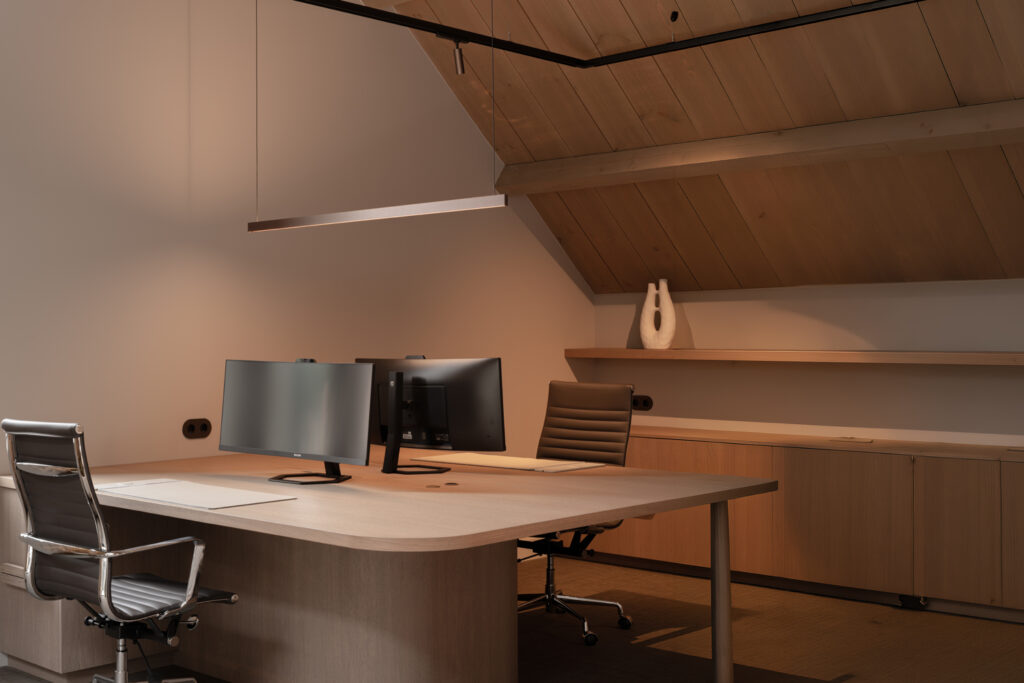 In combinatie met de ledlijnen ontstaat een moderne, toegankelijke uitstraling die perfect aansluit bij het karakter van het kantoor.