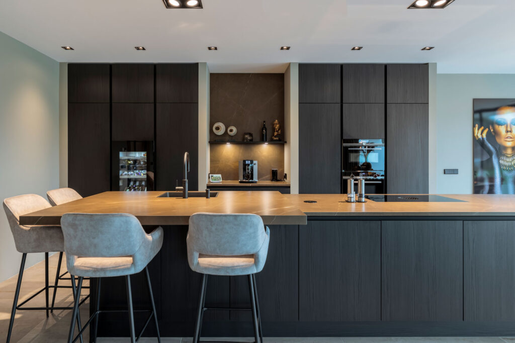 Binnen is alles perfect uitgelicht. Overdag is de verlichting vooral functioneel, terwijl ’s avonds een sfeervolle ambiance ontstaat. De spots boven het keukenblad zorgen voor voldoende licht om comfortabel te koken. Na het eten kan de verlichting eenvoudig worden gedimd tot een aangenaam niveau.